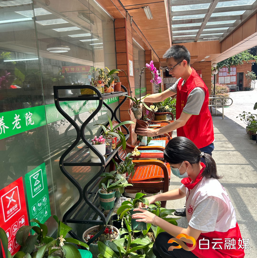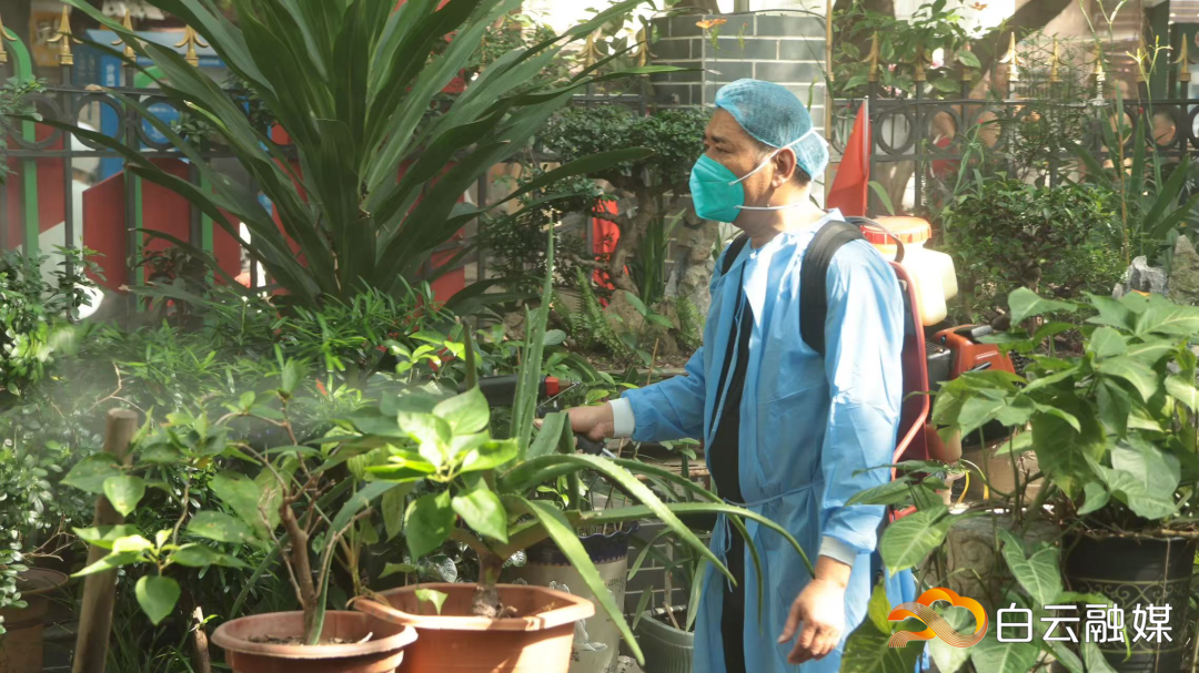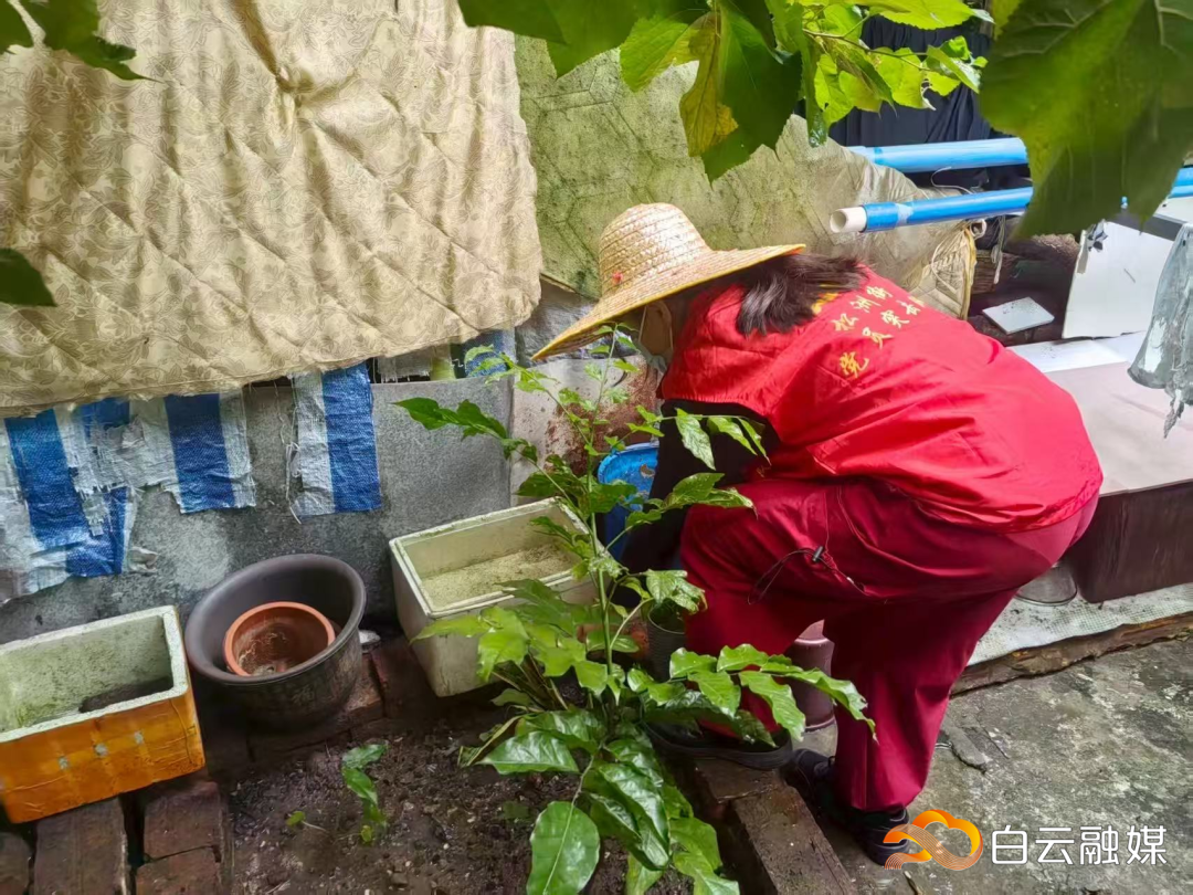 在三元里街颐康中心,社区工作人员和志愿者检查走廊花盆托盘、清积水。